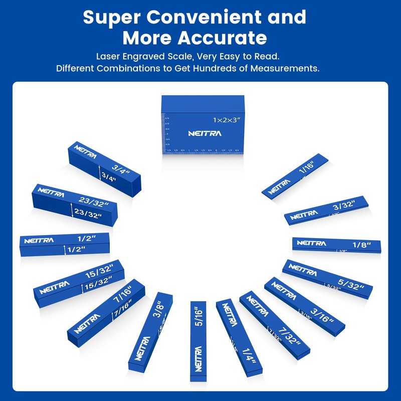 - UNMATCHED PRECISION: Each block is machined to within 0.001" accuracy. Set up gauge blocks are all 3 inches long. Accurate sizes of each individual piece (15 total): 1/16", 3/32", 1/8", 5/32", 3/16", 7/32", 1/4", 5/16", 3/8", 7/16", 15/32", 1/2", 23/32", 3/4", 1x2x3".