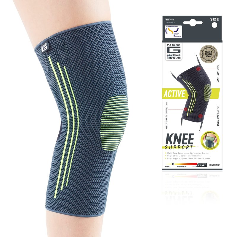 The Neo G Active Knee Support provides a snug, yet flexible fit, helping warm muscles and support the knee during sporting and occupational activities. The Multi Zone Compression surrounds muscles and joints for targeted support and the multi-way stretch allows flexible and safe movement, providing comfortable support and reducing the likelihood of injury. The specialist breathable fabric helps control moisture during intense activities, whilst the slimline, lightweight design means it can easily be worn under clothes for everyday wear and the anti-slip top band is great at helping reduce slipping whilst on the move. The Neo G Active Knee Support fits the left or right knee and is unisex. Helps strains, sprains and instability and helps support injured, weak or arthritic knees. Ideal for sports training and rehabilitation of sporting and occupational injuries whilst also helping reduce the likelihood of re-injury.