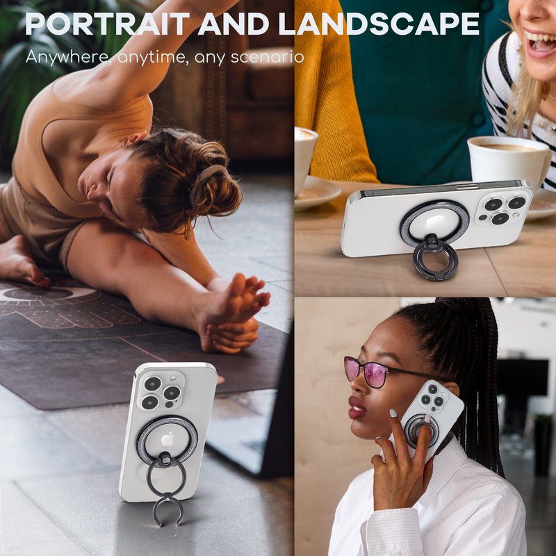 - 【Portriait and Lanscape】Designed for multi-purpose use! It's both a vertical and horizontal phone stand! A sturdy dual-joint design makes the magnetic phone grip support both portrait and landscape viewing positions when placed on a tabletop. Besides, the phone ring holder can be flipped up to 180° and rotated 360° for a comfortable grip for carrying your phone on the go!
