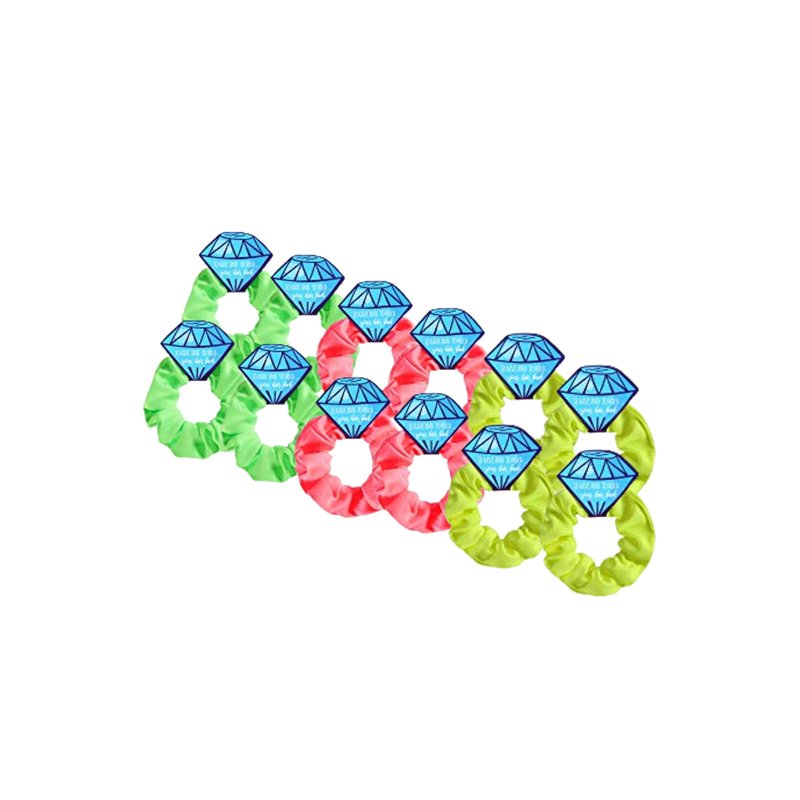 Whether you fancy yourself a neon YELLOW BABE, or a neon GREENGODDESS, or you just want a PRETTY IN PINK scrunchie, our scrunchies come in a pack of 7 that will suit all your colorful 80s dreams! Each scrunchie has a premium card stock diamond topper that says to have and to hold your hair back, making these the perfect bridal hair swag gift your crew will ever receive!