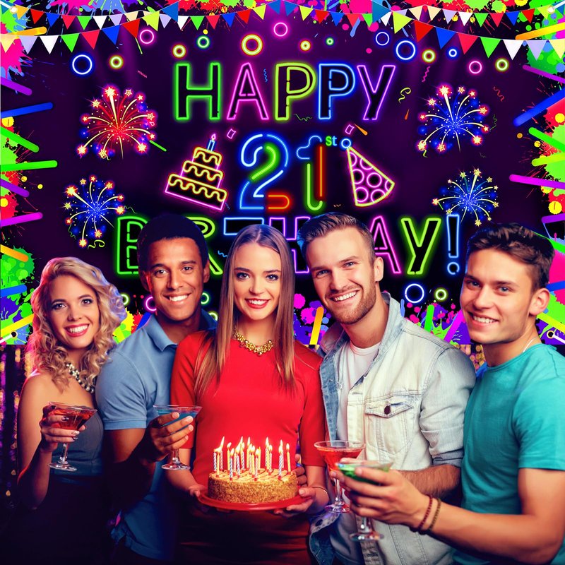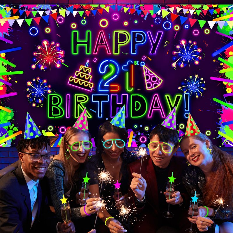 - ✨【Neon Birthday Party Decorations】The neon 21st birthday banner is designed with fun colorful neon birthday elements: graffiti, fireworks, flags, birthday cake, light stick, light circle and glow "Happy 21 Birthday Banner" letters, under UV light, the glow party banner will be highlight of your party and impress your guests