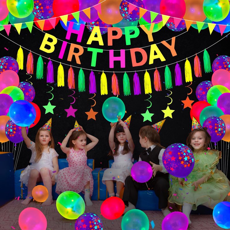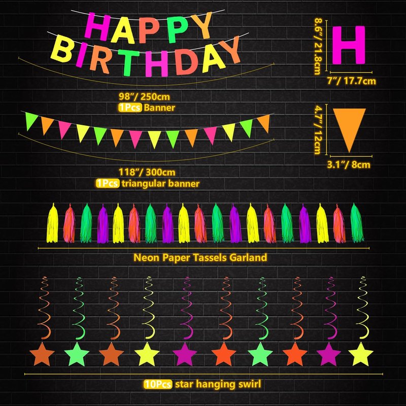 - Package Includes: 20 X 12’’ mixed color neon balloons(blue, red, green, orange, purple); 10 X 12”Purple glow star balloons; 10 X glow star hanging swirls; 1 X glow paper tassels(20 pieces of neon paper tassels in 4 different colors); 1 X multicolored HAPPY BIRTHDAY hanging banner; 1 x neon triangle flags bunting; 1 x glue dot, 1 X black ribbon.