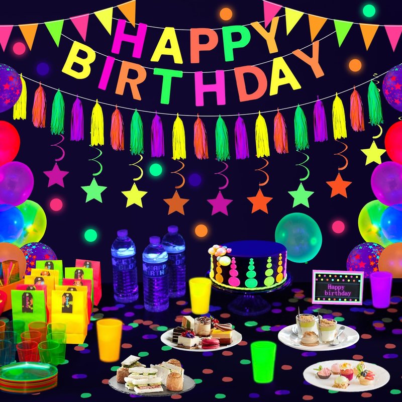 - Eye catching Design: These neon party supplies suitable for kids or young people’s party decorations. Balloons, Banner, tassels are Glow Under A Specific Purple Ultraviolet Light. The colorful neon banner set and hanging stars design on the black background will make your birthday party vibrant and bright colors. When the lights shine on the paper, the color is eye-catching, which can add a happy and attractive party atmosphere, highlight your party!