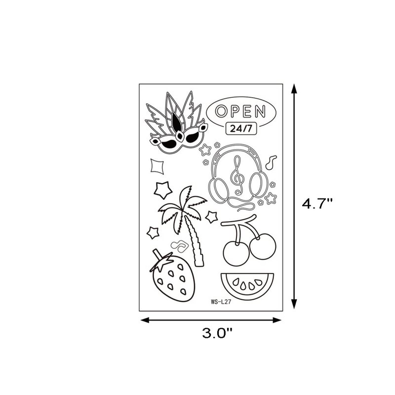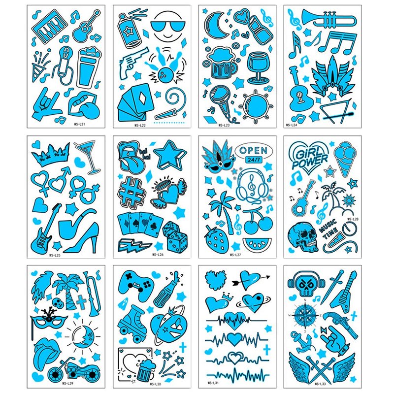 Neon tattoo stickers are irradiated by ultraviolet cold light or sunshine and other special light sources, the tattoo will immediately absorb the light and emit a shiny blue glow .It will make you look sexier and become the topic of the party. If the luminous display is not obvious, you can use the mobile phone lamp to illuminate for about 30s, which can improve the blue light effect. When the irradiation is stopped, the blue light phenomenon will gradually disappear. It can be worn and displayed during the day or night. Package: 12 sheets glitter tattoo stickers Size: 4.7x3.0 inch Luminous tattoos can better decorate your skin with Music, love, feathers, wings, red lips, masks, skulls, wine glasses, guitars and more than 100 other pattern stickers to give you more choices. Can be used on the ankle, arm, belly button, face, foot, forearm, lower back, hip, neck, chest shoulder, waist, upper back, wrist or any position of both. How to use. Tattoos are easy to apply. 1. Cut out the design you like with scissors. 2. Remove the film surface. 3. Apply the patterned side to the skin. 4. Firmly wipe the back of the pattern with a damp cloth or sponge for 10 to 20 seconds. 5. Tear off the paper and dry it naturally. Warm reminder. 1. Don't touch the skin at the paste for 2 hours with water. 2. Do not rub the tattoo area hard when taking a shower. 3. Do not take too long in the shower, too high a temperature will affect the stability of the tattoo. If you smell the ink, don't worry when you open the package. The smell will not carry to your skin, we only use safe, non-toxic ink. To remove the tattoo, just apply baby oil or alcohol with a sponge or paper towel to clean it off. If you want to keep your tattoo for a while, stay away from alcohol and oil.