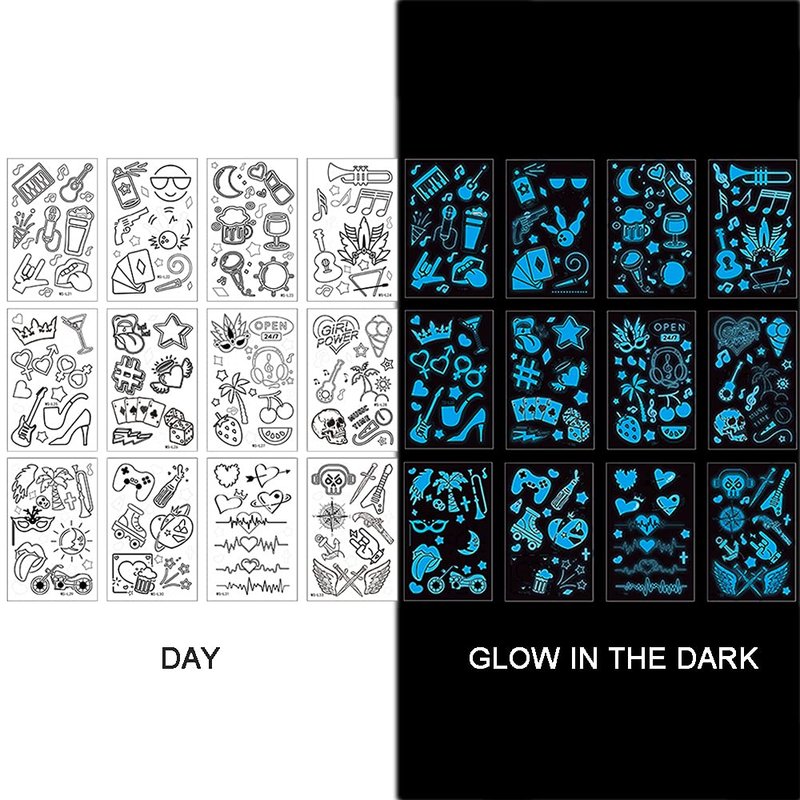 - Glow In The Dark Stickers-Black light tattoo sticker has no color during the day and will glow in the dark. After absorbing the light source under the light to make you more eye-catching.