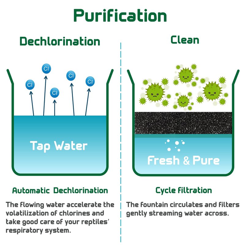 - 💨Dechlorination Automatically : The flowing water accelerate the volatilization of chlorines and take good care of your reptiles’ respiratory system.