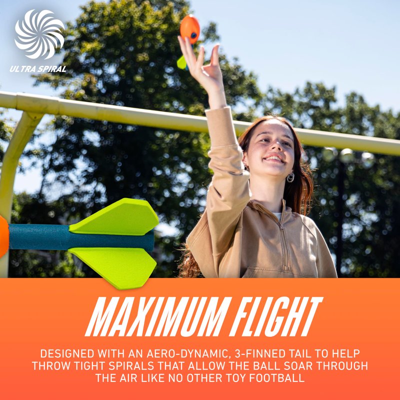 - MAXIMUM FLIGHT: This Vortex football is designed with an aero-dynamic, 3-finned tail to help throw tight spirals that allow the ball soar through the air like no other toy football