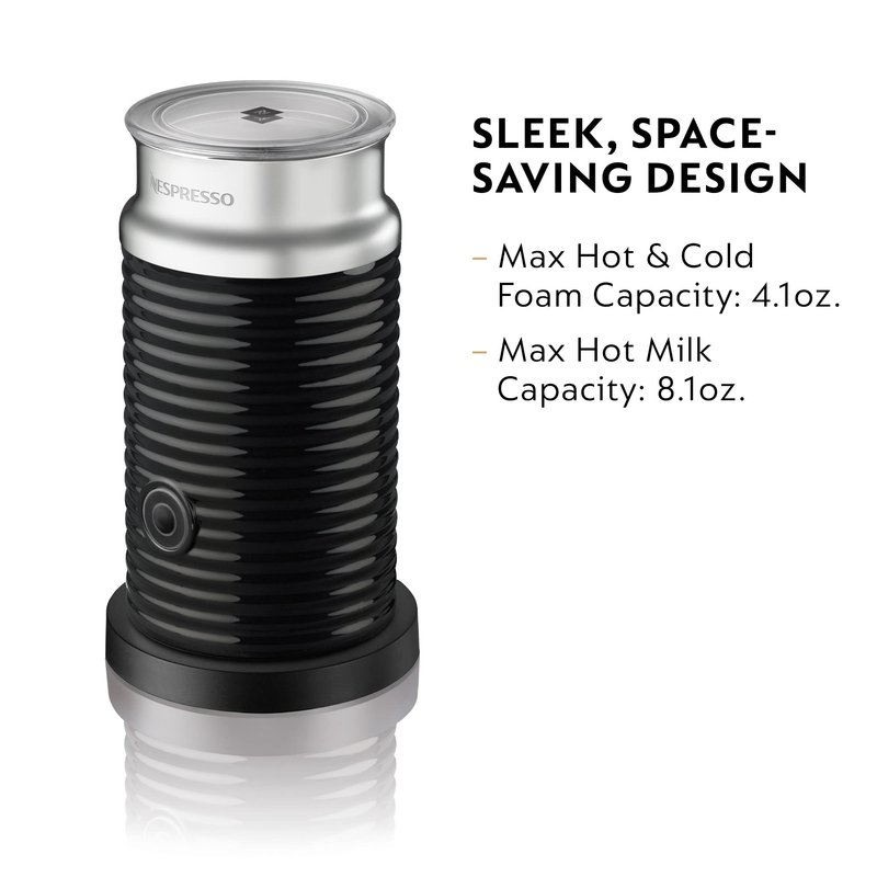- "SLEEK DESIGN: The Nespresso Aeroccino 3 milk frother features a slim line base to easily fit anywhere, and automatically shuts off when finished. Non-stick surface makes for easy cleaning. "