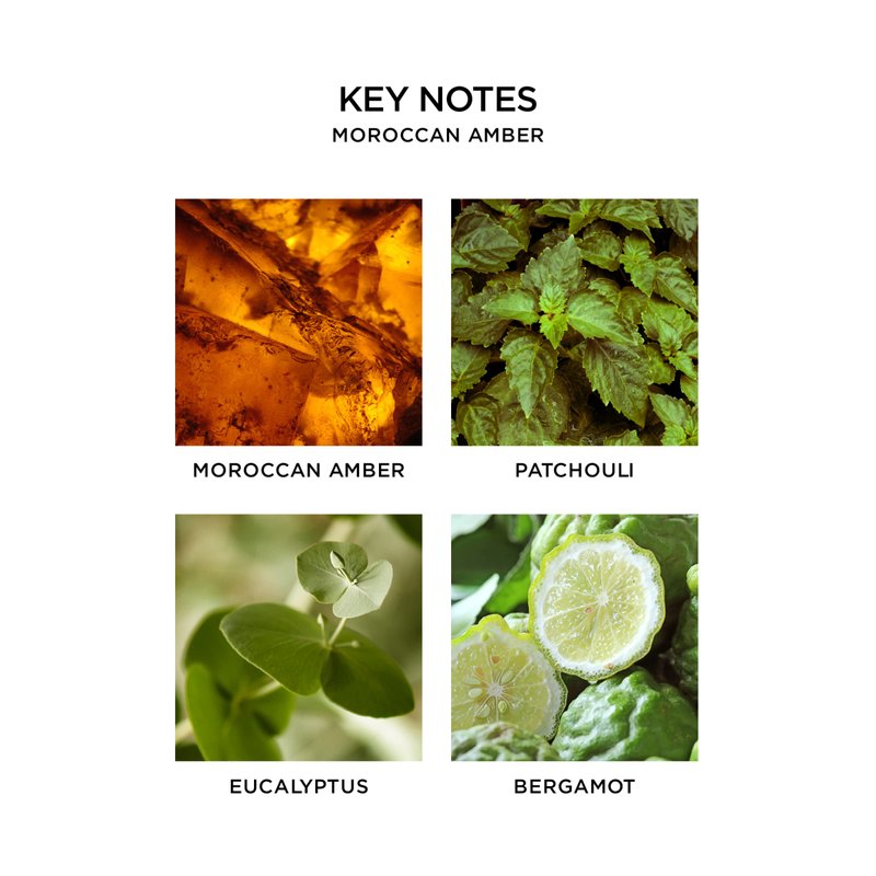 - WOODY AND SEDUCTIVE: Moroccan amber, sweet patchouli, heliotrope, and bergamot with a hint of eucalyptus