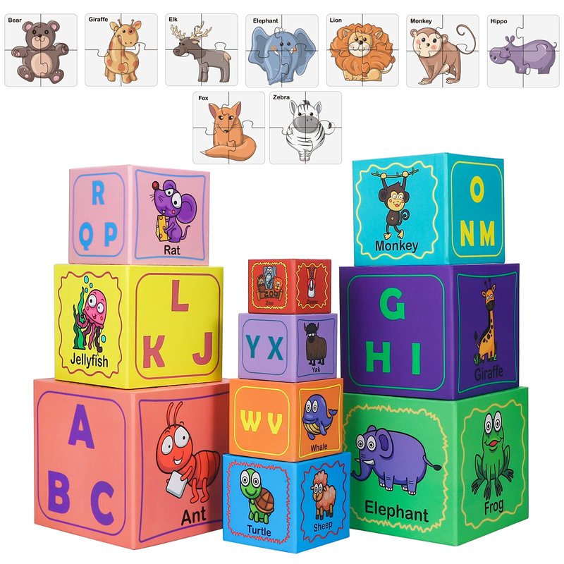 - Nesting and Stacking Blocks Stacker composed of 10 cardboard Cube boxes, showing Alphabet A-Z, different objects, corresponding word. And the animals puzzle includes 9 animals, 36 pieces, 4 pieces per 1 animal.