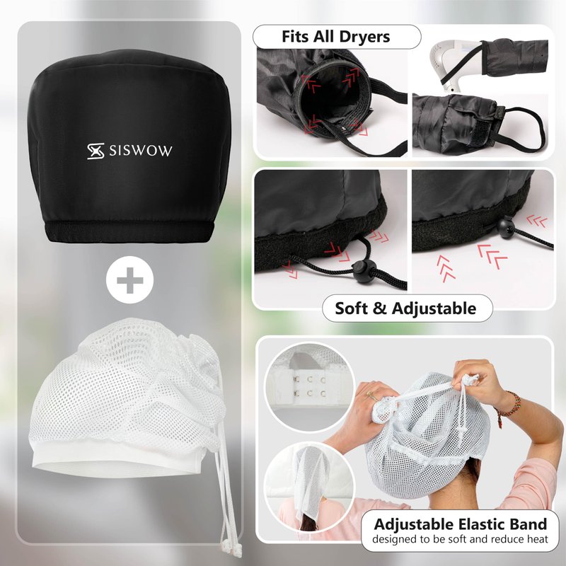 Elevate your home styling with our Hair Dryer Bonnet and Plopping Hair Cap combo. Designed for salon-quality results, this essential pair works together to cut drying time, boost hair health, and offer versatile styling options. Our plopping cap helps to reduce friction and breakage, while the bonnet’s even heat distribution aids in protecting your hair from excessive heat. Perfect for any hair type—long, short, curly, or straight—our hair dryer bonnet adapts to a range of treatments from deep conditioning to oil applications. Simplify your routine and explore limitless styling options with just one essential product! Engineered to connect seamlessly with any standard hair dryer, our hair dryer bonnet offers flexibility for every styling session. Featuring an adjustable drawstring for a perfect fit, ensures comfort and efficiency for all head sizes. Enhanced Hair Health: The microfiber material of the plopping hair cap helps maintain the hair's natural texture while reducing frizz and breakage, leading to healthier, more manageable hair. Perfect Fit for All: Our elastic-edge plopping cap adjusts to all head sizes, securing your locks precisely for optimal drying and styling comfort! Our product is designed to optimize your routine and enhance styling outcomes. Ideal for everyone from busy professionals to style aficionados, these tools are crucial for creating effortless, beautiful hairstyles. Add the ultimate convenience and flair to your hair care regime with our combo today!