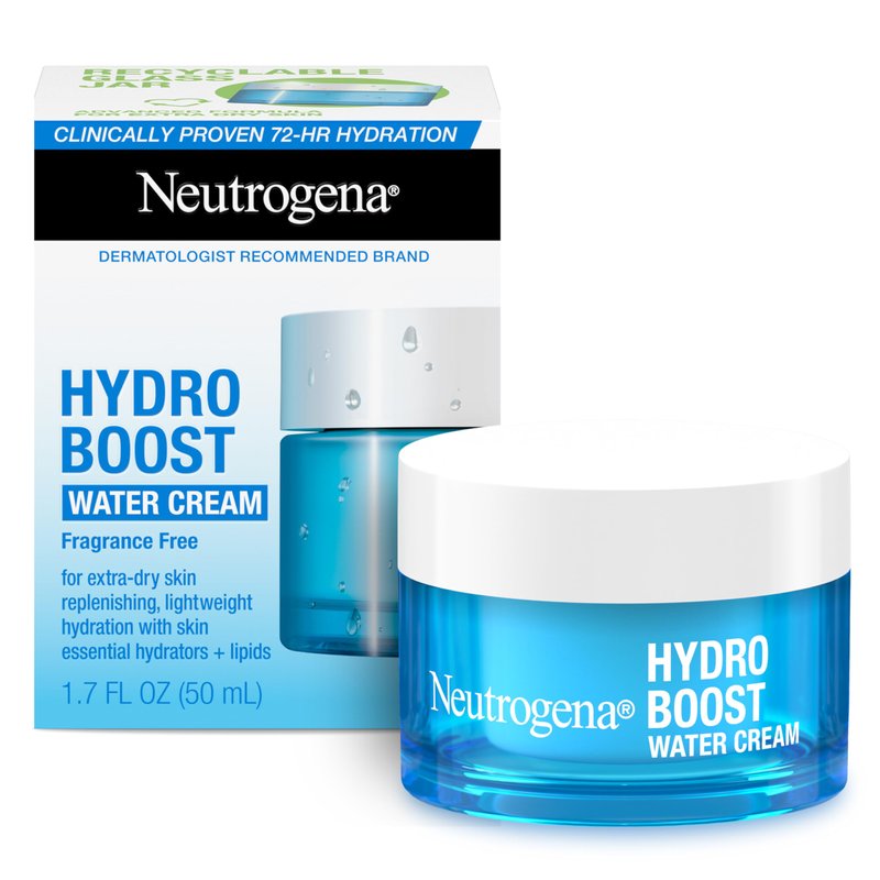 - Skincare set from Neutrogena, containing one, 1.7-ounce recyclable glass jar of Hydro Boost Fragrance-Free Water Cream Moisturizer & one, 0.5-fluid ounce trial size Hydro Boost Hydrating Cleansing Gel