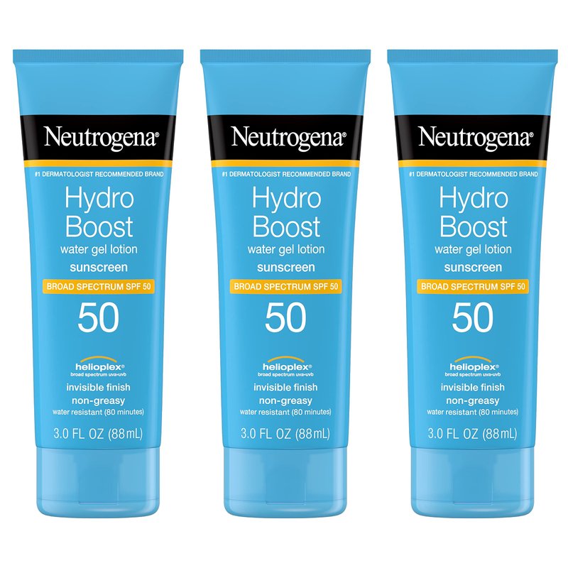 - 3 pack of travel-sized 3-fluid ounce tubes of Neutrogena Hydro Boost Water Gel Sunscreen Lotion with broad spectrum SPF 50 that offers UVA/UVB protection as it helps hydrate skin without the greasy feeling