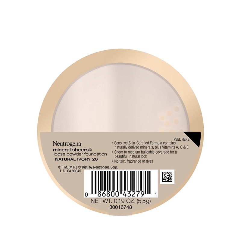- Neutrogena Mineral Sheers Lightweight Loose Powder Makeup Foundation in Natural Ivory 20 helps even and enhance skin clarity, tone and texture