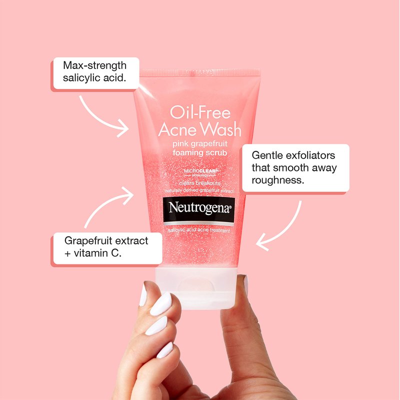 - 6.7-fluid ounce tube of Neutrogena Oil-Free Acne Wash Pink Grapefruit Foaming Face Scrub, with 2% salicylic acid acne medication to help treat breakouts while gently exfoliating your skin