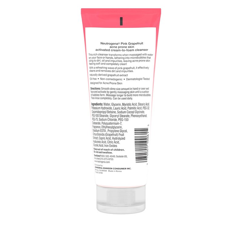 - 3.5-ounce tube of Neutrogena Pink Grapefruit Activated Cream-to-Foam Cleanser is specially formulated for acne prone skin to cleanse skin for an effective, complete clean