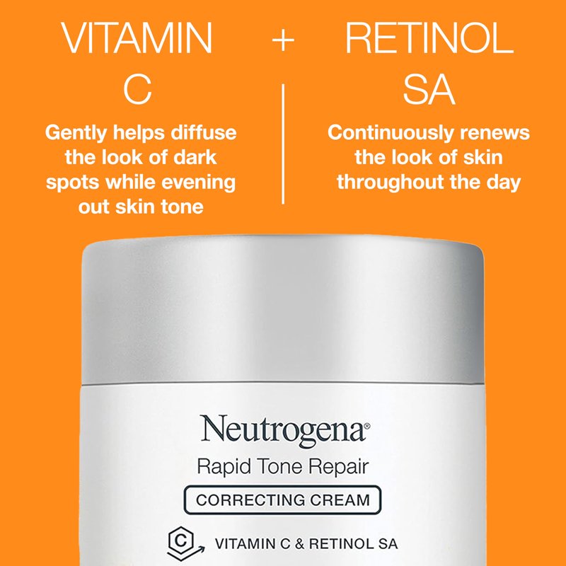 - 1.7-ounce jar of Neutrogena Rapid Tone Repair Retinol + Vitamin C Correcting Cream with vitamin C, retinol, and hyaluronic acid for noticeably even skin tone in just 1 week. Package contains 30% less glass and a 25% smaller carton (compared to previous packaging)