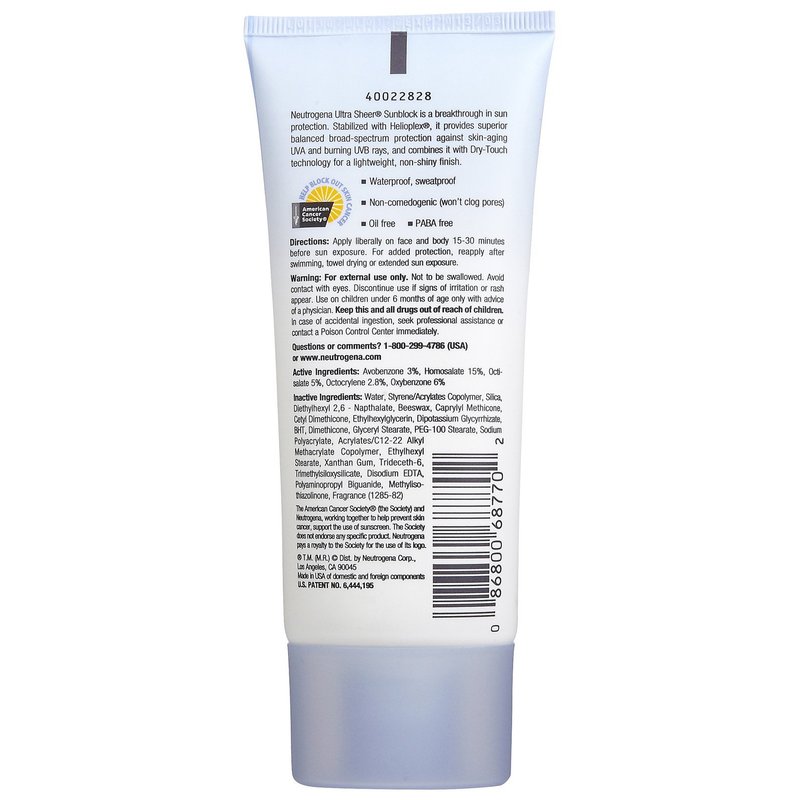 Get powerful sun protection without the heavy finish with Neutrogena Ultra Sheer Dry-Touch Sunscreen. This lightweight Broad Spectrum SPF 70 sunscreen lotion with Dry-Touch technology absorbs fast for a clean, ultra-light feel and non-shiny finish. This sunscreen is formulated with Helioplex Technology, which offers superior broad spectrum protection from aging UVA rays and burning UVB rays. Fast-absorbing, lightweight and water-resistant, this non-greasy sunscreen lotion formula is non-comedogenic and PABA-free. Protect yourself as you get your daily dose of sunshine.