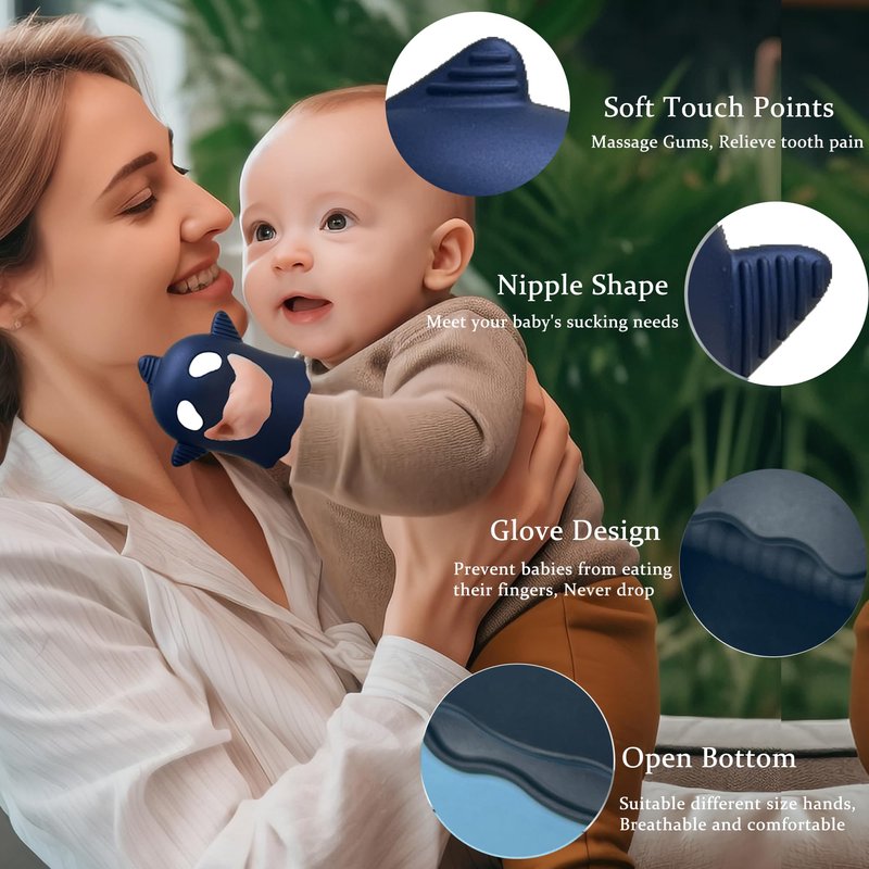 - Teething doesn't have to be boring! When you find that your baby is starting to suck fingers and chew toys, you can try to give your baby this teether toy that can exercise the gums. The soft silicone material can not only protect your baby's gums but also exercise the grasping ability of the baby's small hands.