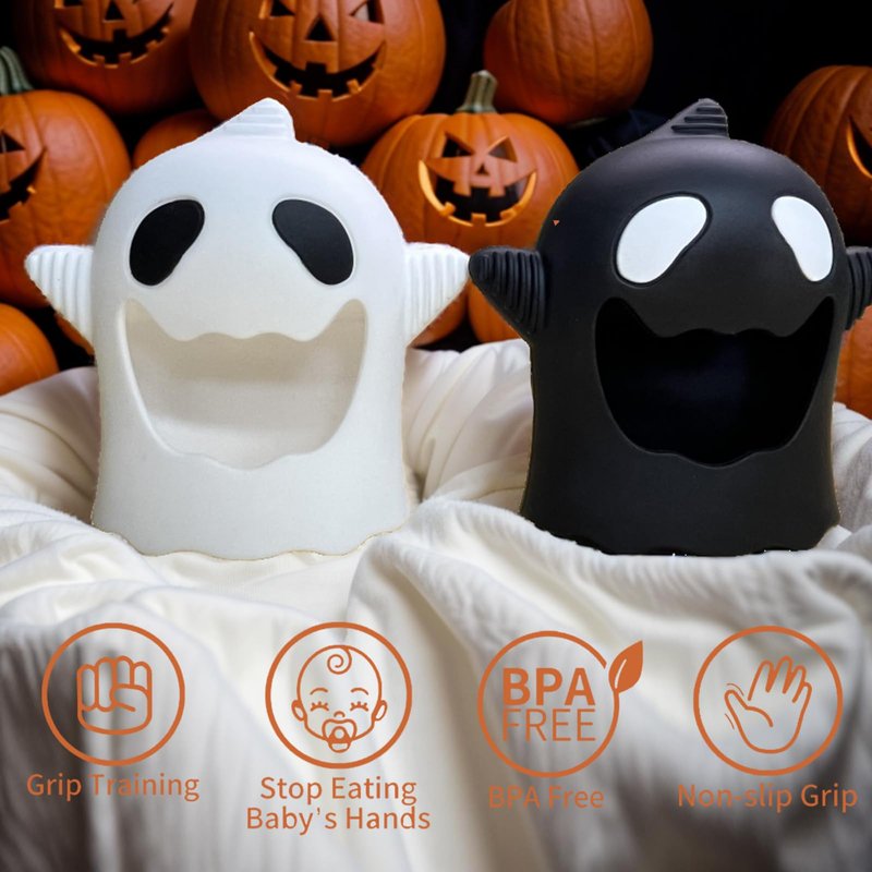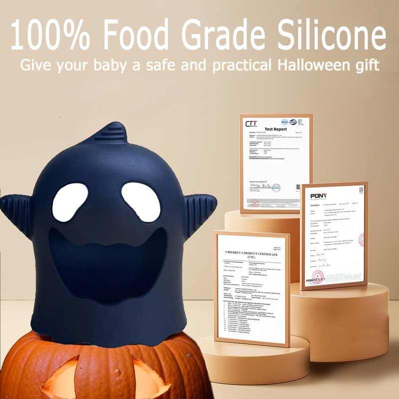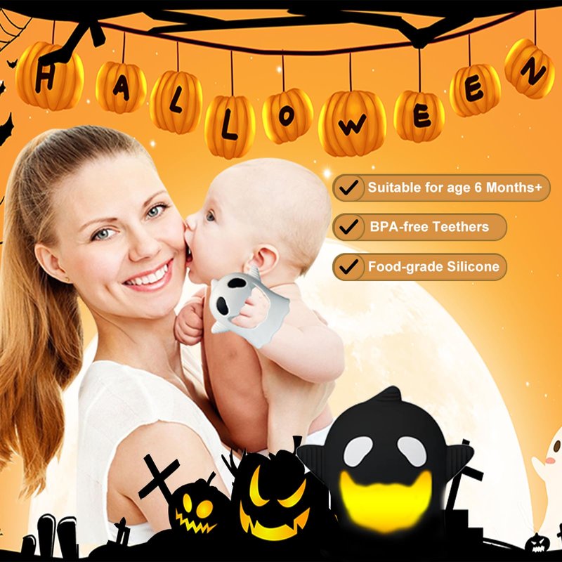 Never Drop Teething Toys for Babies, Baby Mitten Silicone Teether for Soothing Teething Pain Relief, Baby Chew Toys for Sucking Needs (Halloween Ghost-Black)