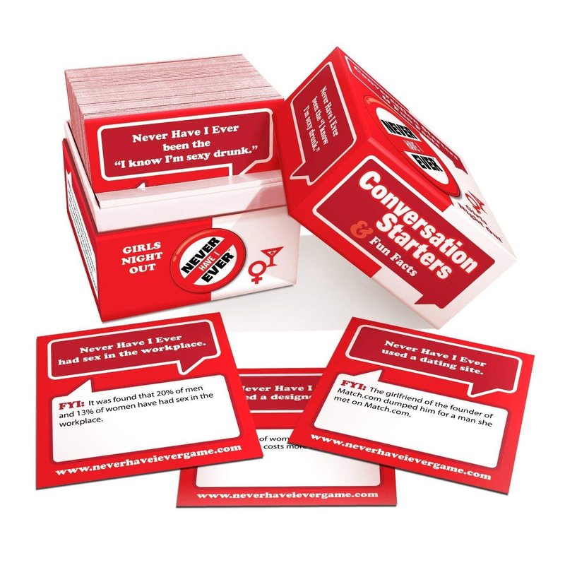 Conversation Starters Girls Night Out Adult Game. Perfect for stocking stuffers, college reunions, girls night out, road trips, college students adult parties, etc. These are not your run of the mill card games, because these tiny little boxes include giant fun with both conversation starters and fun facts! Get your friends together and spark interesting conversation with questions like Never Have I Ever has a friends with benefits sexual relationship or Never Have I Ever made out with a guy in the back seat of a car. Then learn interesting fun facts like, two thirds of all college students have been involved in a friends with benefits relationship and a couple in London locked lips for 31 hours, 30 minutes, and 30 seconds making it the longest kiss ever recorded. The Conversation Starters are available in two titles: College Life Edition (ages 18+) and Girls Night Out Edition (Ages 18+). Each includes a collection of 150 fascinating. separately.