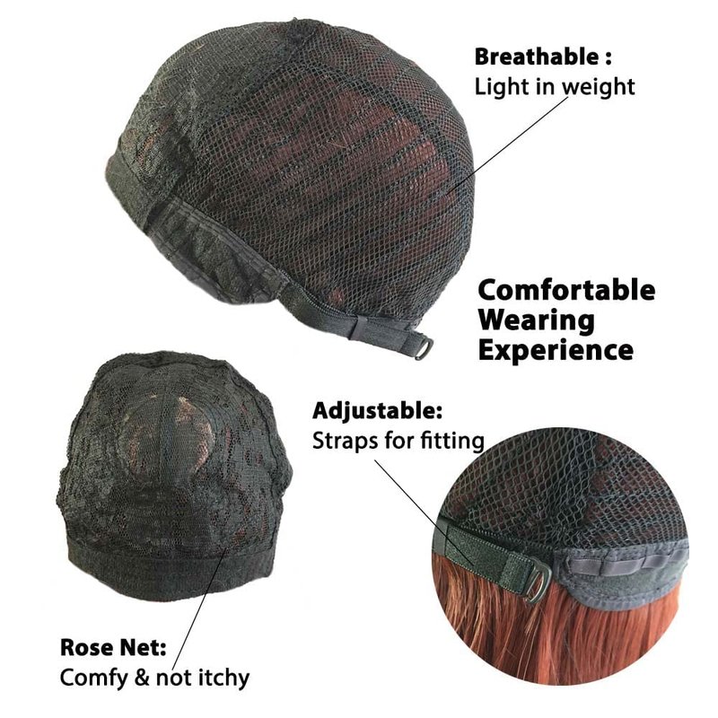 Made of heat resistant fiber, auburn red tone wavy light fringe bangs short hair with the adjustable straps inside the cap to fit the size. Very high quality look so natural, soft and comfortable.