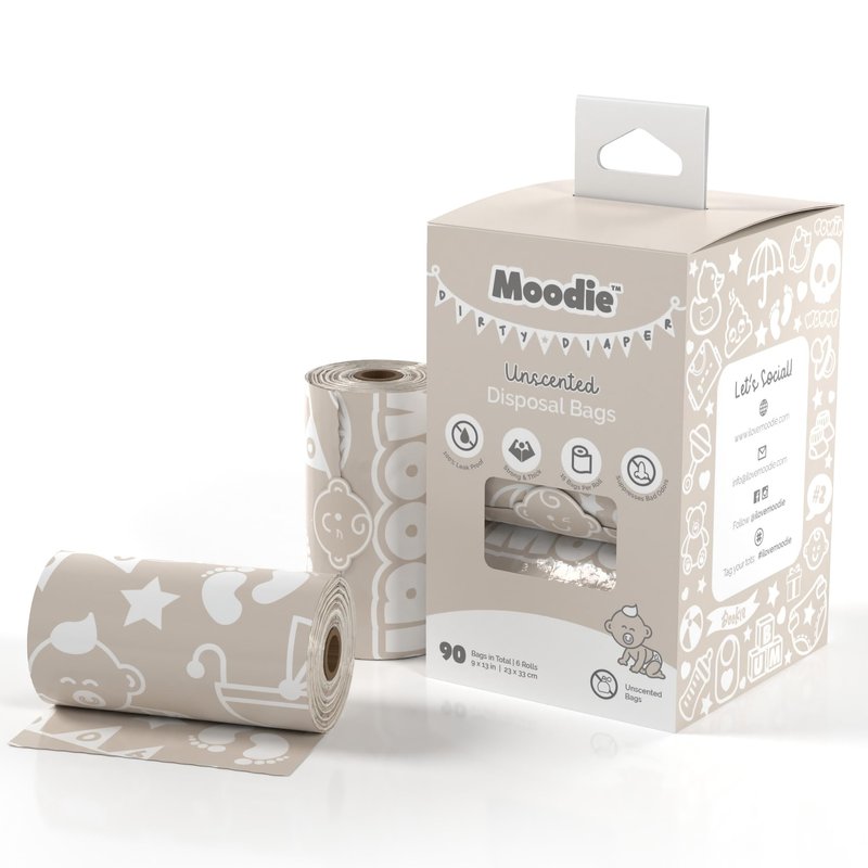 Moodie's NEW disposable diaper bags offer a more sanitary way to dispose of dirty diapers. These thick bags will contain and trap unpleasant odors and the strong material is leakproof to avoid any unwanted escapes. Our 9 x 13inch bags seal in liquids and odors from dirty diapers, messy foods, pet excrement, wet clothing or anything else that needs to be contained. This 6 roll refill pack includes 90 individual unscented diaper bags that are perfect for travel, quick on-the-go diaper changes or convenient at home use. Our refill trash bag rolls will fit most standard size dispensers, though they pair perfectly with our award winning Moodie teddy bear diaper bag dispenser!