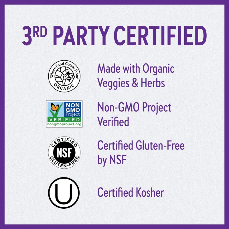- Made with Certified Organic Vegetables & Herbs, Non-GMO Project Verified, 100% Vegetarian, Certified Kosher, Certified Gluten-Free by NSF, No Synthetic Fillers, Packaging may vary