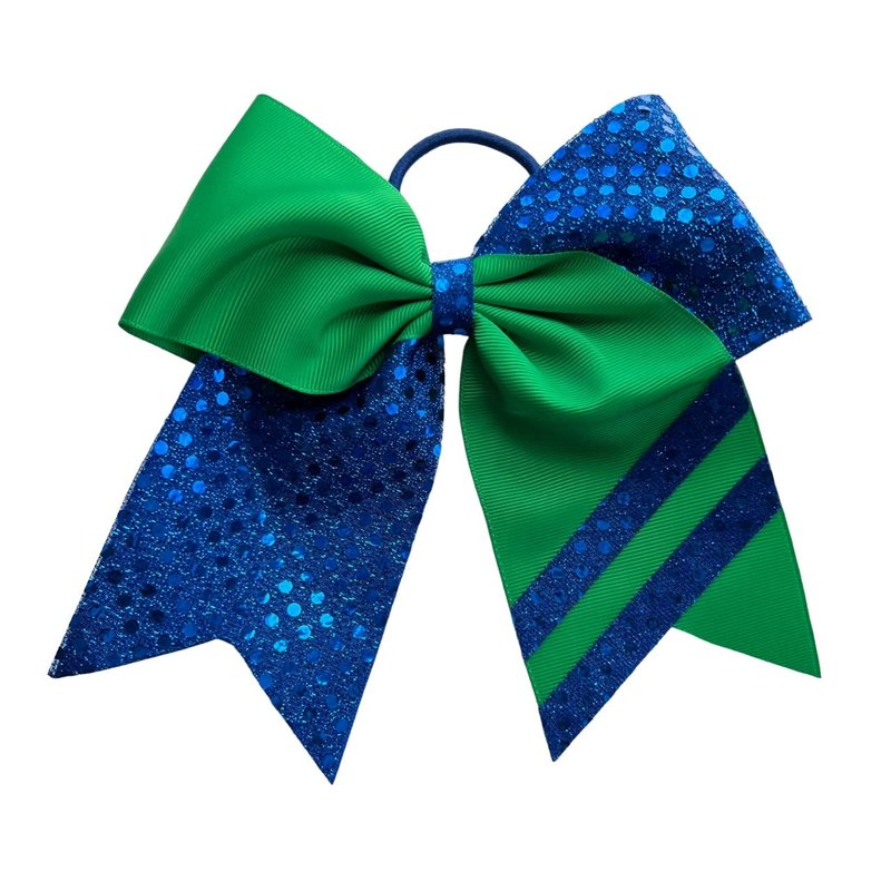 This listing is for a Boutique Grosgrain Ribbon Cheerleading Hairbow! FUNKY & FUN! These are hand-made by me! The Hairbow is made out of green colored premium 3 inch grosgrain ribbon and a sparkly royal blue confetti dot tulle fabric! These Boutique Bows are approx. 7 inches in length and 7 inches wide. Cheer Bows are attached to a stretchy elastic hair tie! Great for Cheer Practice, Football Games, Pageants, Cheerleading, Gymnastics, Dance, Vacations, Birthdays, Christmas, Competitions and more! Your daughter will love these bows! Check out my store for other hairbow colors & styles!