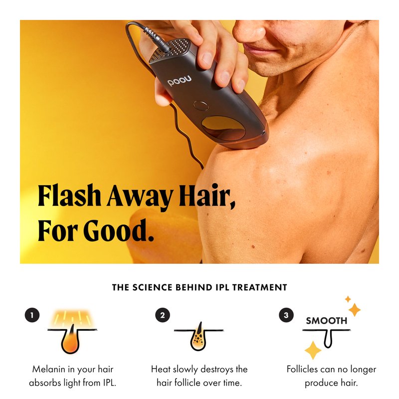 Safely remove unwanted hair with The Flasher 2.0 by Nood. Works everywhere that hair grows, including bikini, Brazilian, underarms, legs, and face. Start seeing results in 2-3 weeks and permanent hair removal in 6-8 weeks. Pain-free light-based technology. Quick 10-Min Treatments. Fully digital display.