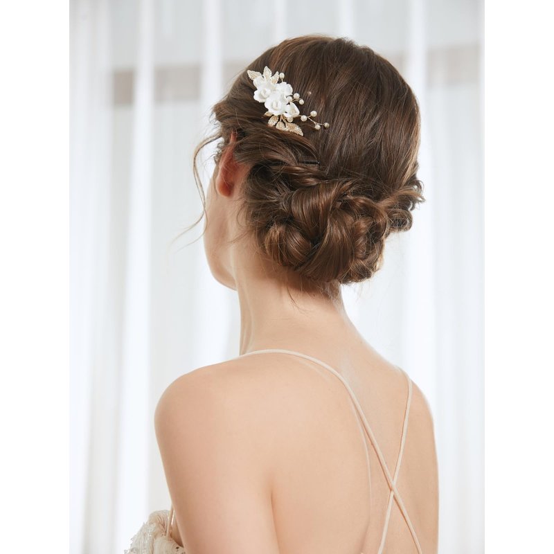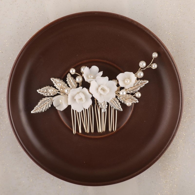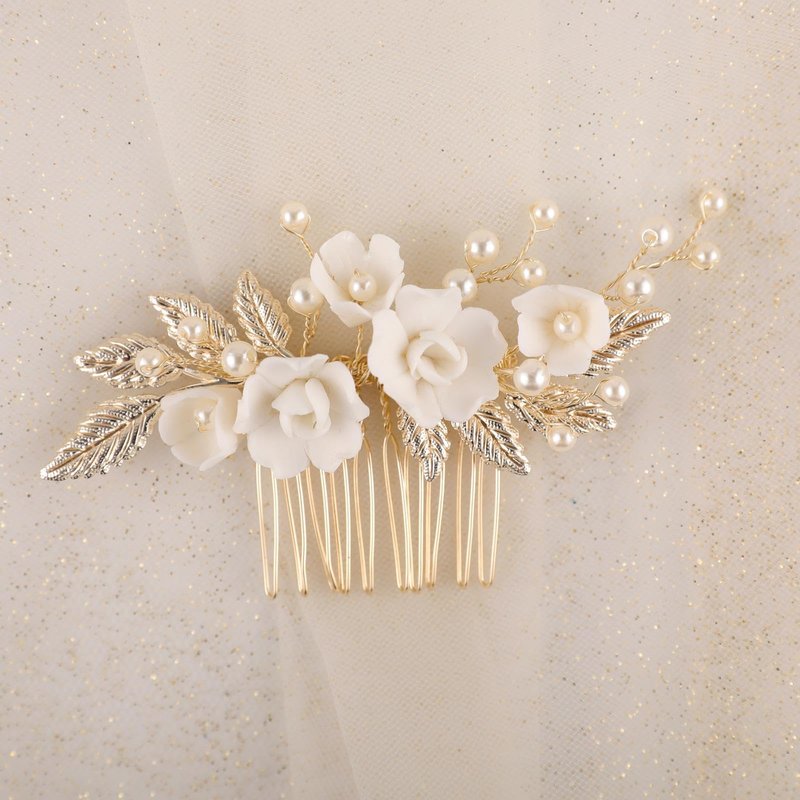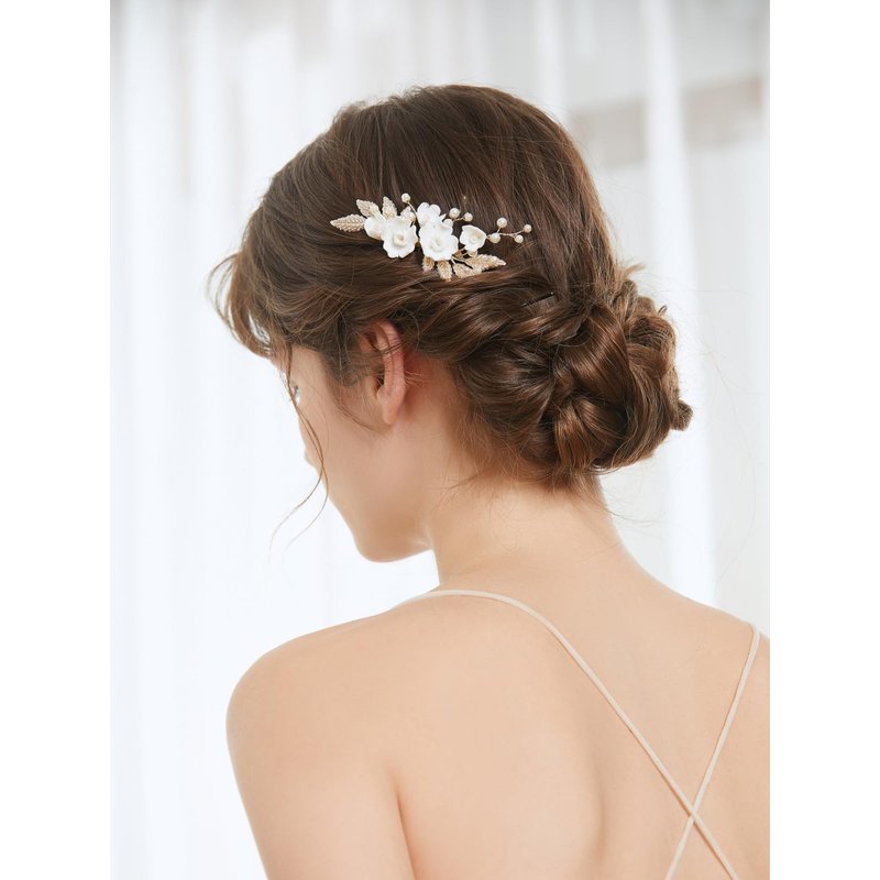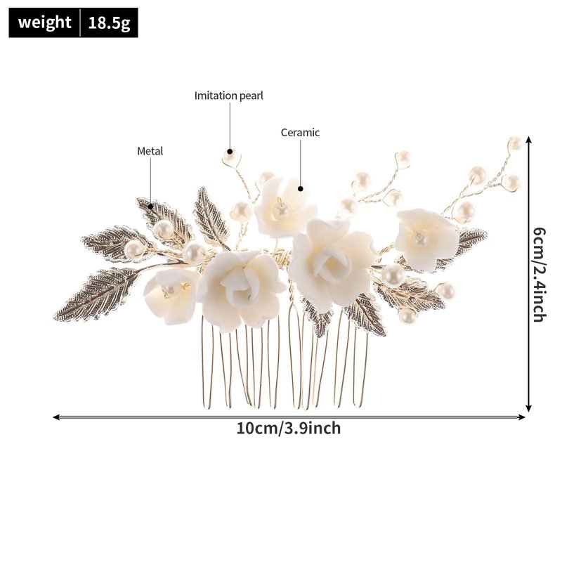 - ❀Artificial flowers are handmade of high quality ceramic which makes these flowers more pretty and realistic. The gold hair comb is also decorated with alloy leaves and imitation pearls. High quality gold metal wedding hair accessories are very sturdy which can be wore for a long time. Smooth metal hair side combs won't hurt your hair.