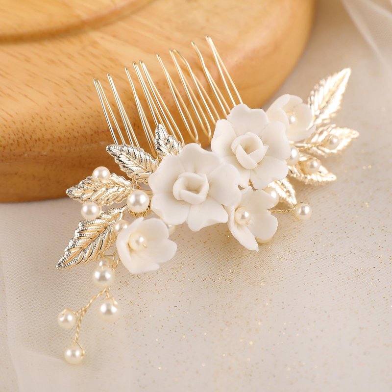 New Handmade Ceramic Flower Wedding Hair Accessories for Women Pearl Gold Alloy Leaf Wedding Hair Comb Bridal Jewelry Classical Wedding Headpiece for Bride