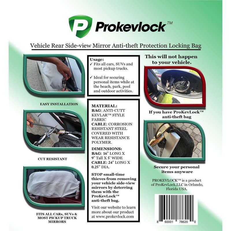 - UNIVERSAL FIT ANTI-THEFT MIRROR COVER: ProKevLock side mirror cover fits all Cars, SUVs, Minivans, Vans, and most Trucks sideview mirrors. Easy to install and remove, while giving you a peace of mind that this deterrent device will protect your sideview mirrors from small time thieves making this a valuable item to be on the list of your vehicle accessories. This is a theft deterrent device that will protect the expensive inner mirror from being stolen.
