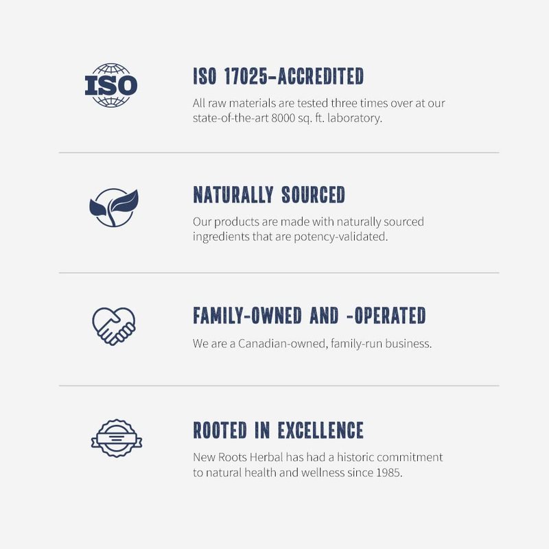 - ISO 17025: All New Roots Herbal products have been rigorously tested in an ISO 17025 Accredited Laboratory.