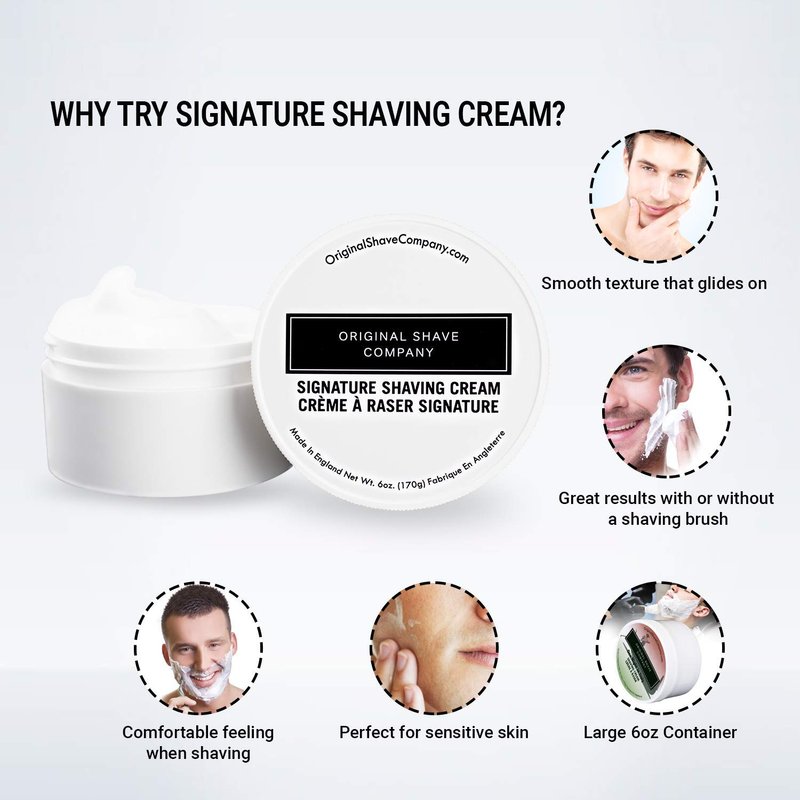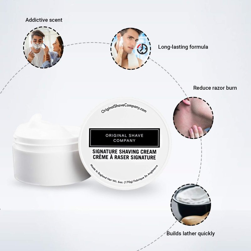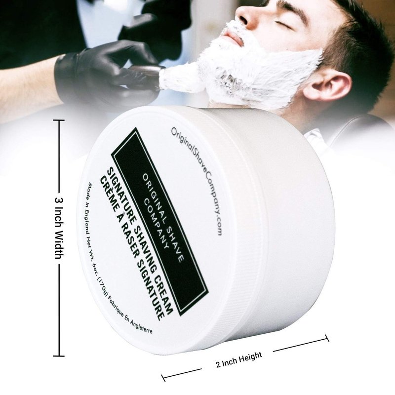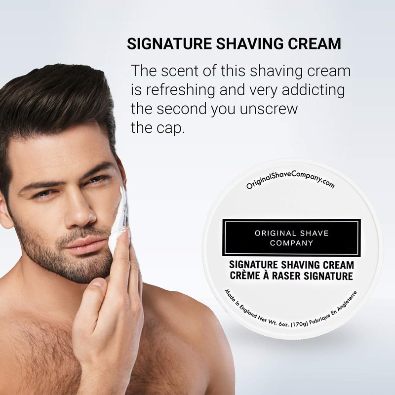Brought to you by Original Shave Company, our Signature Shaving Cream brings you the best ingredients for the ultimate wet shave. If you enjoy a thick lather that gets built up easily without using too much product, you will absolutely love this Signature Shaving Cream. Custom formulated by our team in England, this 6oz (170g) tub is larger than most luxury shaving creams and will last through many shaves while performing extremely well with any shaving razor. The scent of this shaving cream is refreshing and very addicting the second you unscrew the cap. In fact, you may find yourself opening the cap multiple times a day just to get a quick sniff in. Trust us, this isn’t unordinary by any means. Although our Signature Shaving Cream was designed to be fresh and light, the scent does not vanish minutes after you complete your wet shave. What makes our shaving cream a must try is how it isn’t an overwhelming scent filled with harsh ingredients. Harsh ingredients usually follow you around for days while presenting an aggressive odor around family and friends. Not good. Perfectly capable of being used without a brush, all you would have to do is wet your face with warm water and apply a small drop of shaving cream across the beard growth and work in the product with your fingers until you get an even coverage. If you love using shaving brushes like we do, this will enhance the experience with the Signature Shaving Cream even more. For shaving brush applications, get your brush wet with warm water and remove excess water by squeezing it with your hand/fingers. Apply a small amount of the Signature Shaving Cream to the brush and start rotating the brush in your shaving cup or bowl with quick rotations until you build up your desired lather. You can use the screw on/off cap of the Signature Shaving Cream as a mixing bowl or cup if needed. Start or even end your day feeling fresh, recharged and amazing with our Signature Shaving Cream.