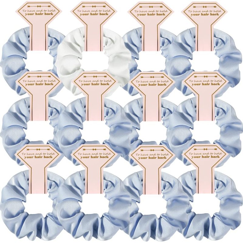 New Smooth linen Satin Bridesmaid Scrunchies 12 pack Proposal Gifts Elastics Hair Ties Scrunchies Bachelorette Party Favors Satin Bridesmaid Gift for Bridal Wedding Parties guests (White & Fresh Blue)