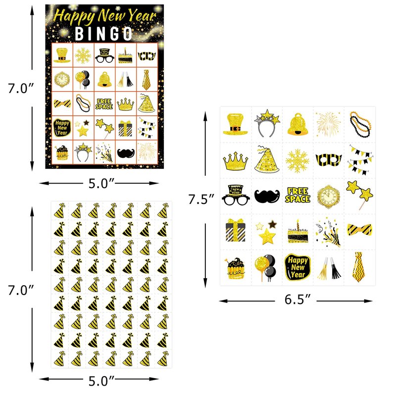 - Package Includes: 24 happy New Year Bingo Game Cards, 441 Hat Bingo Card Chips and 24 call out cards; 7 x 5 1/5 inches player cards; Easily cut along dotted lines of chips sheets and calling card sheet
