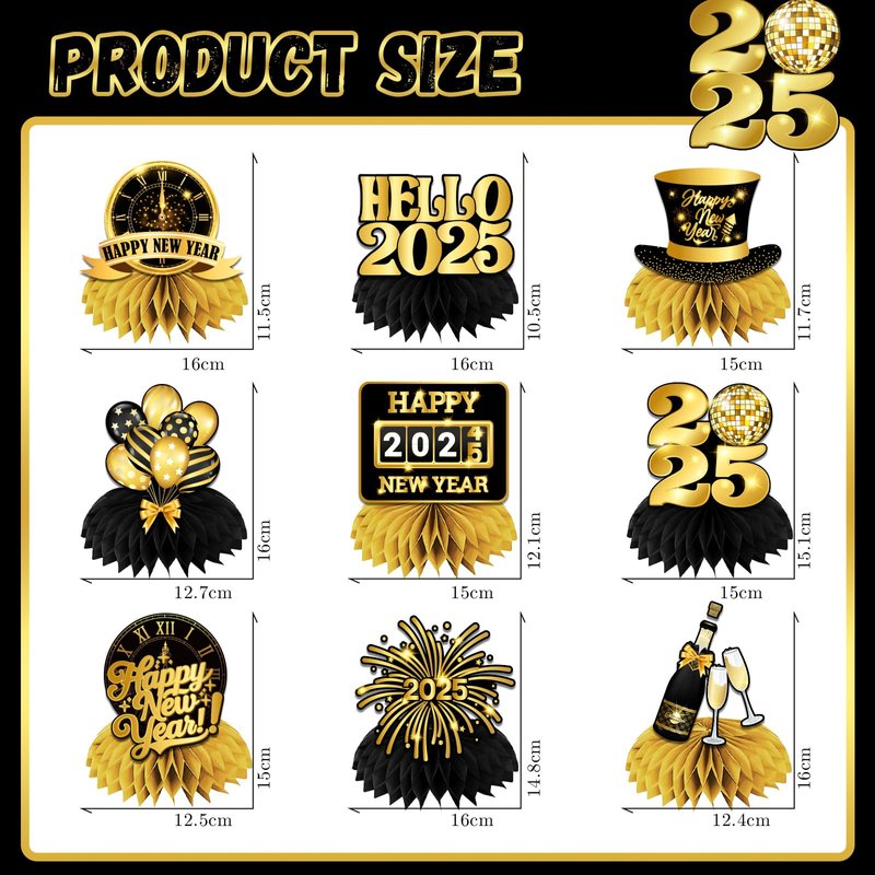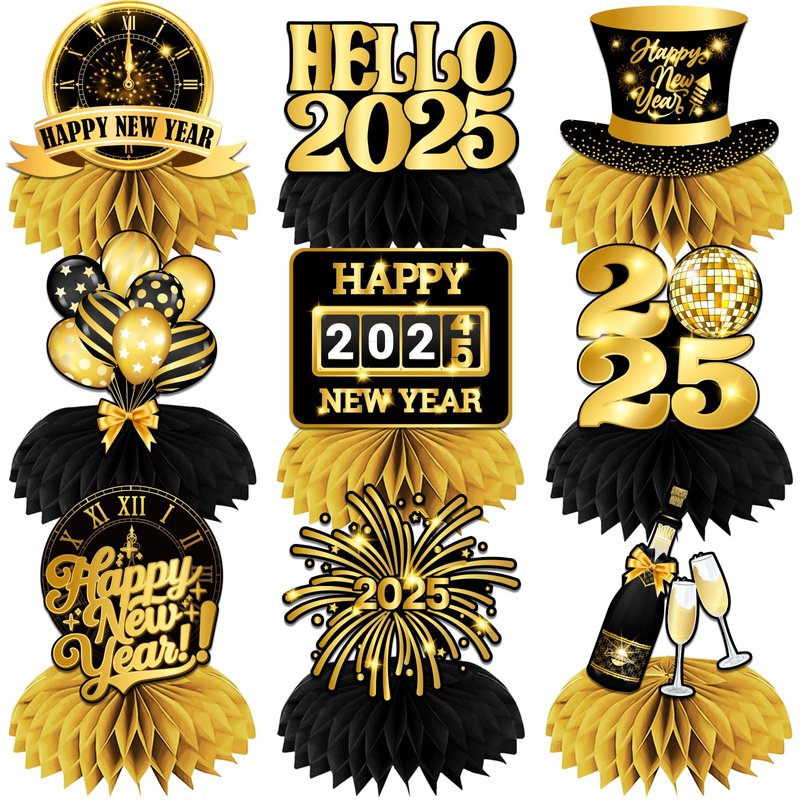 - NEW YEAR DECORATIONS: Illuminate your 2025 with our 2025 New Year honeycomb centerpiece and bid farewell to 2024!This New Year table decorations 2025 set includes 9 different styles designs, classic black and gold with New Year themed patterns such as fireworks, clocks, disco balls, hats, balloons, champagne, as well as celebratory words like "Happy New Year 2025" and "Hello 2025", adding a luxurious and elegant atmosphere to your New Year's event