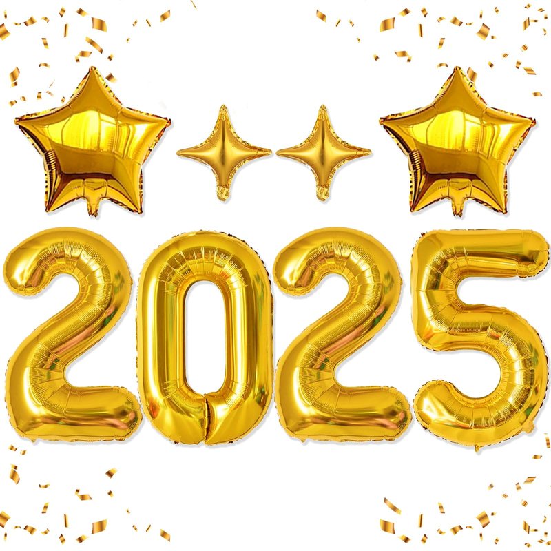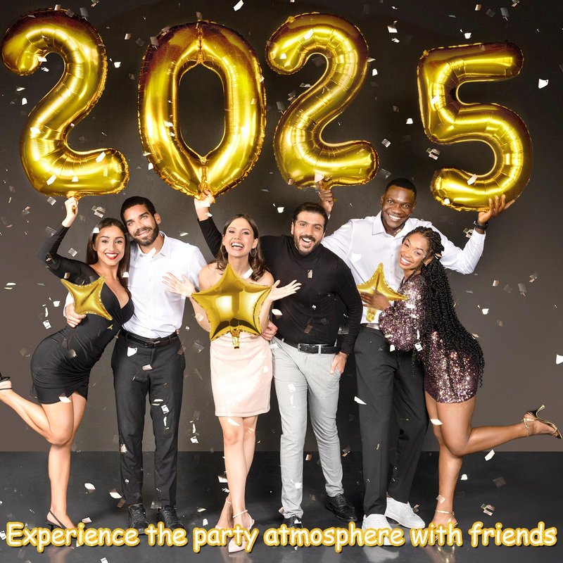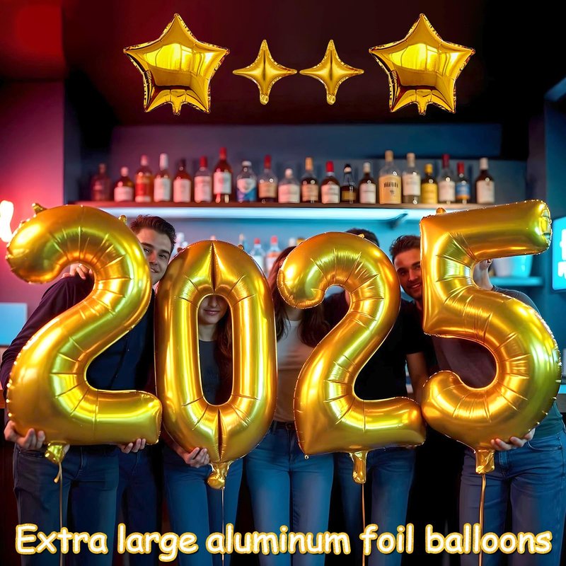 - 🎉【2025 Gold Balloons Design】Our gold 2025 foli balloons includes 40inch Number 2025 Balloons, 2pcs 18" pentagram gold balloons, 2pcs 10" four-pointed star gold balloons,2pcs Inflatable Straws, 20pcs glue dots, 32ft Ribbon. They are perfect for creating a memorable New Year's Eve celebration. The gold foil finish adds a touch of elegance that will surely impress your guests.