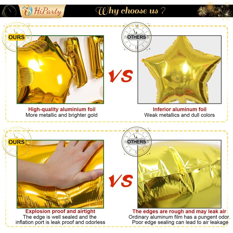 - 🌈【Premium Quality Materials】Made from top-quality aluminum foil, our gold balloons are durable and long-lasting. They won't easily deflate or lose their shape, ensuring your decorations stay vibrant throughout the entire New Year's Eve party. Light and sturdy, just fill with 90% helium to float. Self-sealing and reusable, you can use the straw to deflate the balloon after the party.