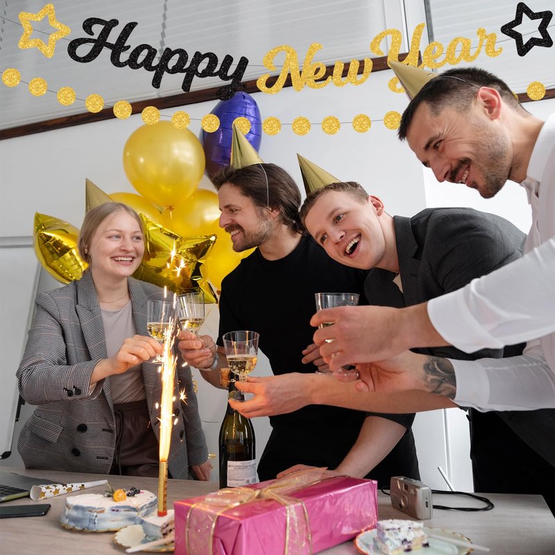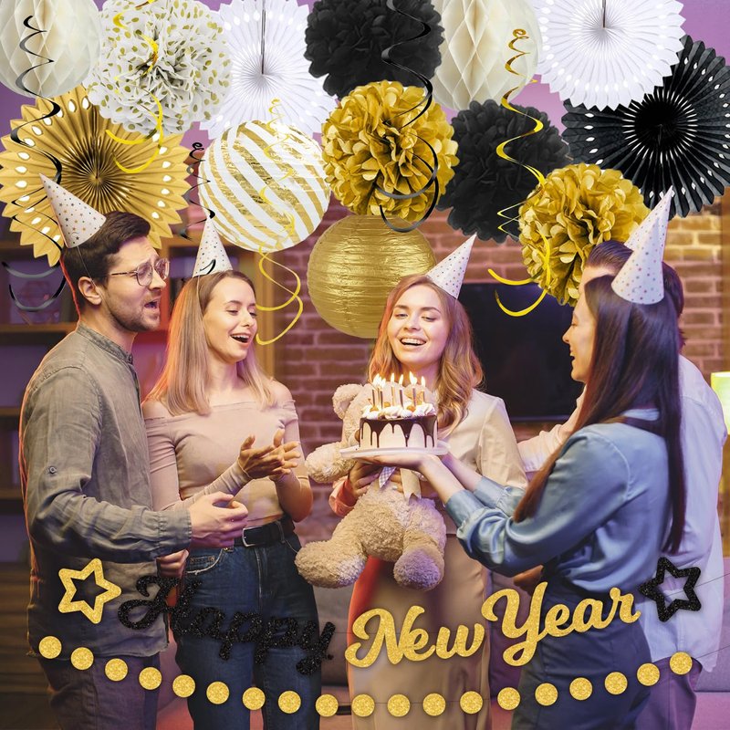- New Year Party Decorations 2025:A set of 2025 New Year party decoration accessories. Take photos with family and friends in 2025, celebrate New Year's Eve, and indulge in the luxurious quality of our black, gold Happy New Year decorations. Our meticulously crafted decorations will add unparalleled elegance to your special day