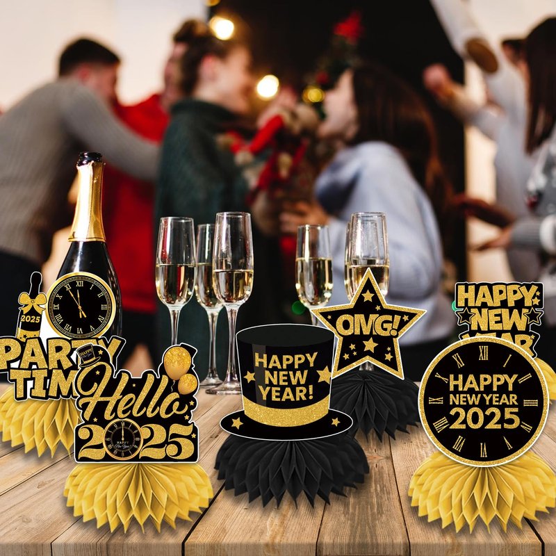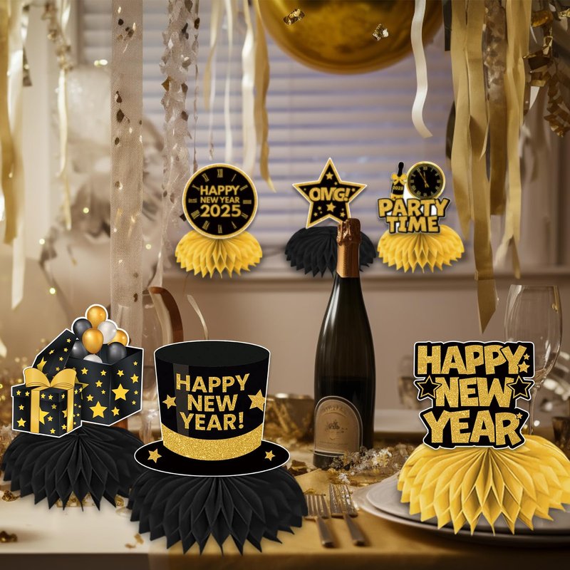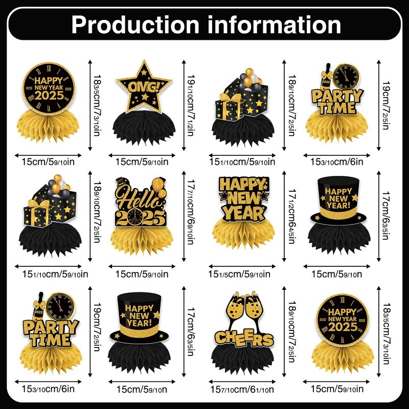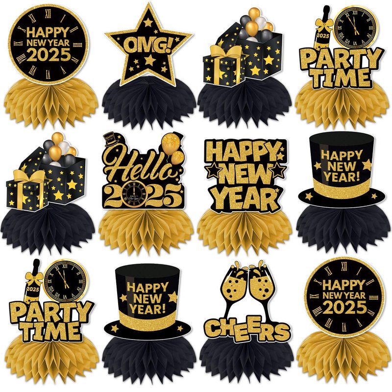 - rich quantity and style: our new years eve party supplies kit contains 12 pcs nye decorations 2025 table centerpieces with different styles. our new years eve party supplies 2025 honeycomb centerpieces have rich quantity and styles, such as clocks, stars, gift boxes, and so on, which will be sure to grab people's attention with their stylish designs and cute characters and it will be a big bit to your parties