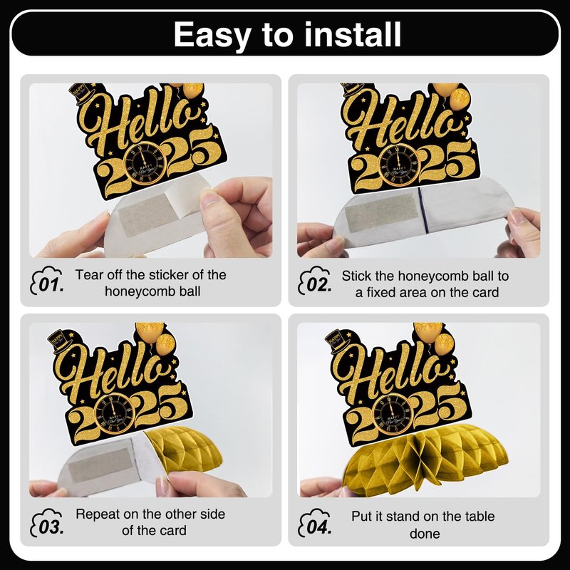 - simple to assemble: these new years decor honeycomb centerpieces can be assembled according to the pictures in just a few seconds. you just need to tear off the glue dot sticker on the back of the honeycomb, unfold the honeycomb, and paste the cardstock pattern, repeat on the other side of the card, then you can get a cute honeycomb decoration. use the new years eve decor to put them in your favorite display area to easily decorate your party, saving time and effort