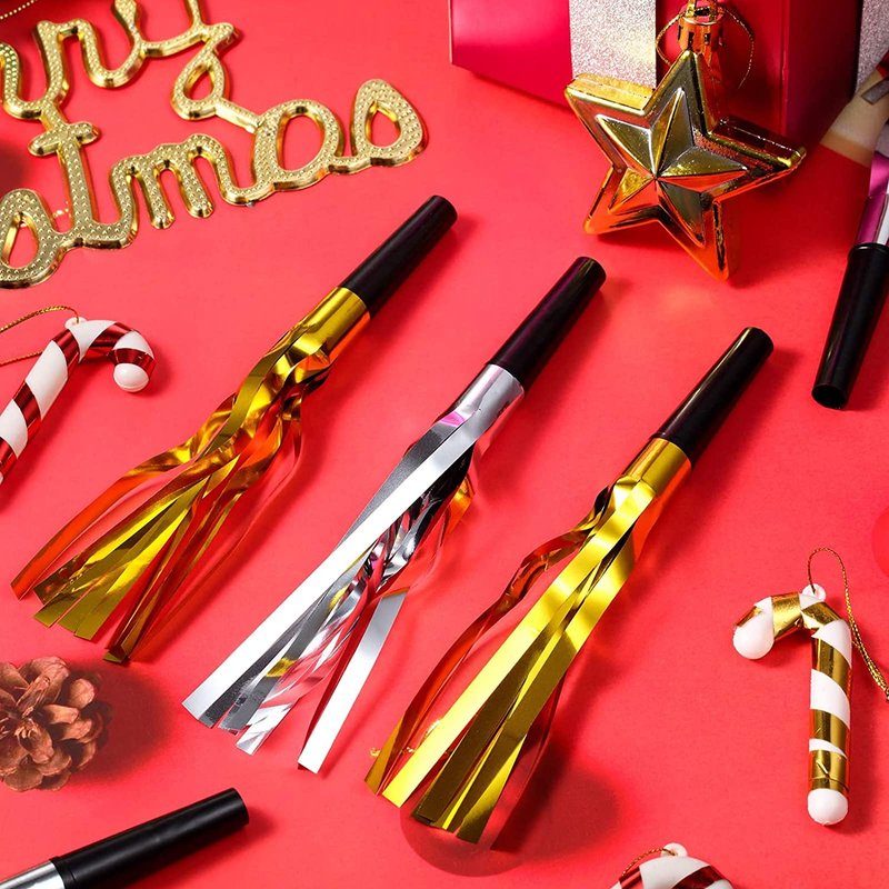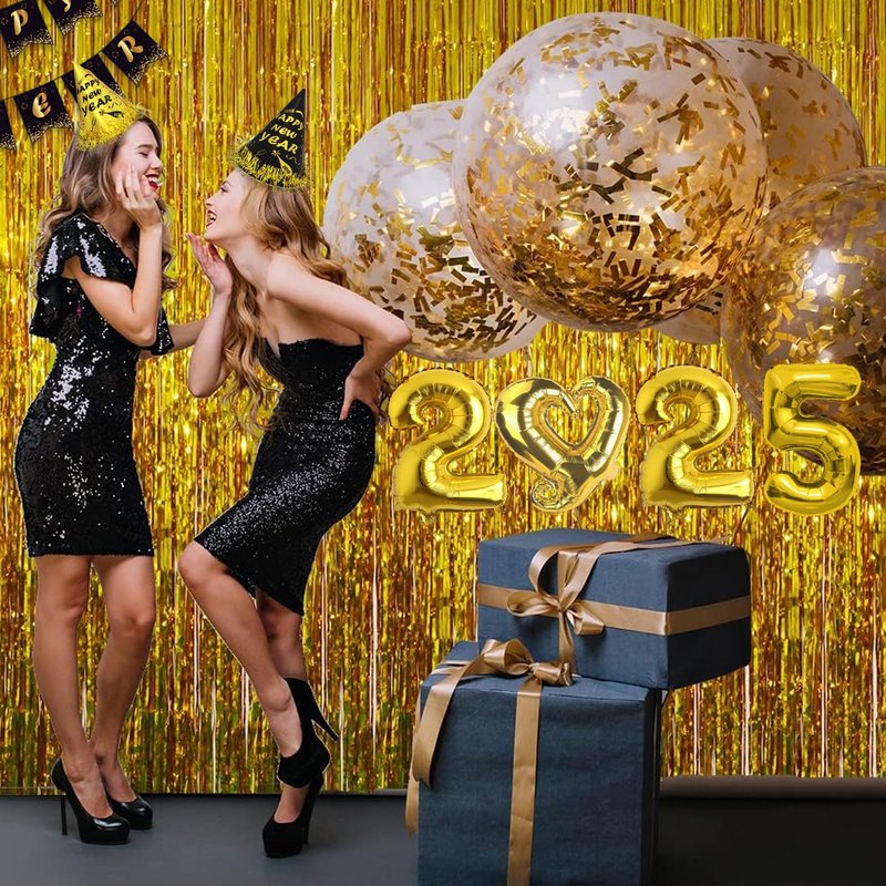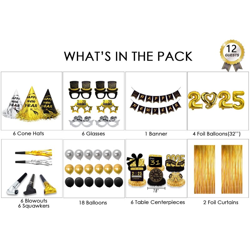 - NEW YEARS EVE PARTY SUPPLIES 2025 - This new years party supplies pack includes 6 party hats, 6 party glasses, 12 blowouts, 18 balloons, 6 centerpieces for table, 2 foil Curtains, 2025 Foil Balloons and a happy new years banner