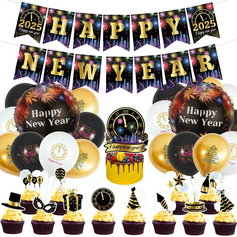 - New Years Decorations: you will get 1set firework happy new year banner,2pcs new year foil balloons,18pcs latex balloons,1* new year Cake Topper,12*cupcake topper.