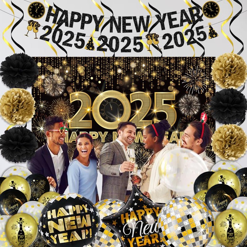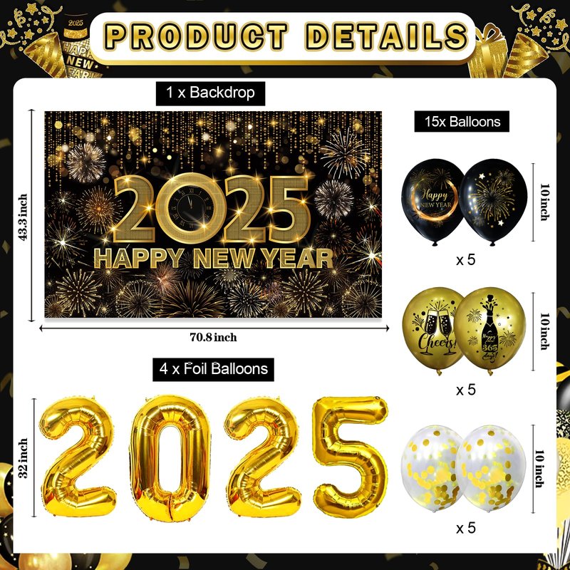 - Package Include: Our New Years Eve Party Decorations include 1*"HAPPY NEW YEAR" banner 1*2025 2025 2025 Banner, 6*paper flowers, 1*70.8 in x 43.3 in new years backdrop, 6*new year hanging decorations, 1*16in"2025" number fiol balloons, 5*black 5*gold 5*white and gold confetti balloons, and 2*disco balloons, 2*new year balloons. Each set of new year balloons comes with a straw to help you inflate each letter and a long ribbon.