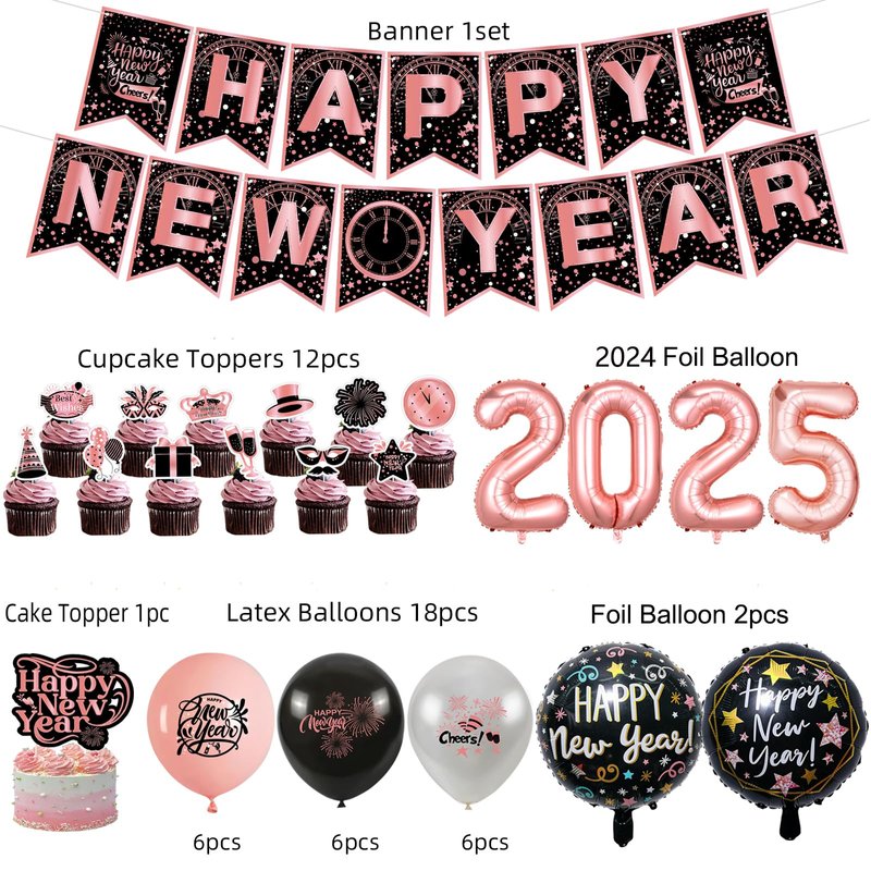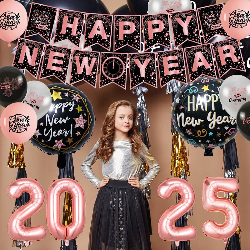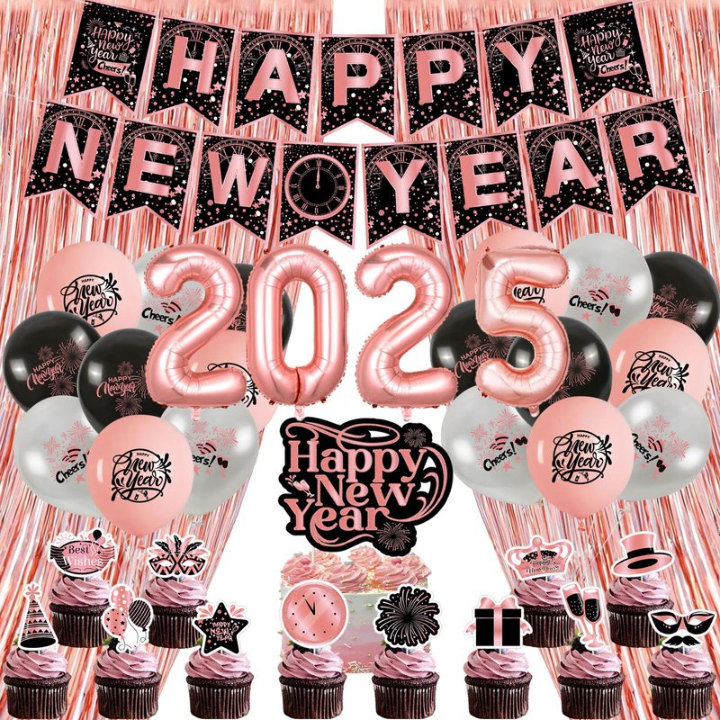 - New Years Decorations: you will get 1* Rose Gold happy new year banner,1 *Rose Gold 2025 Foil Balloons,18* latex balloons,1* new year Cake Topper,12*cupcake topper,2*Rose Gold Fringe Curtain.prefect combination to meet your New Years party decorations need.