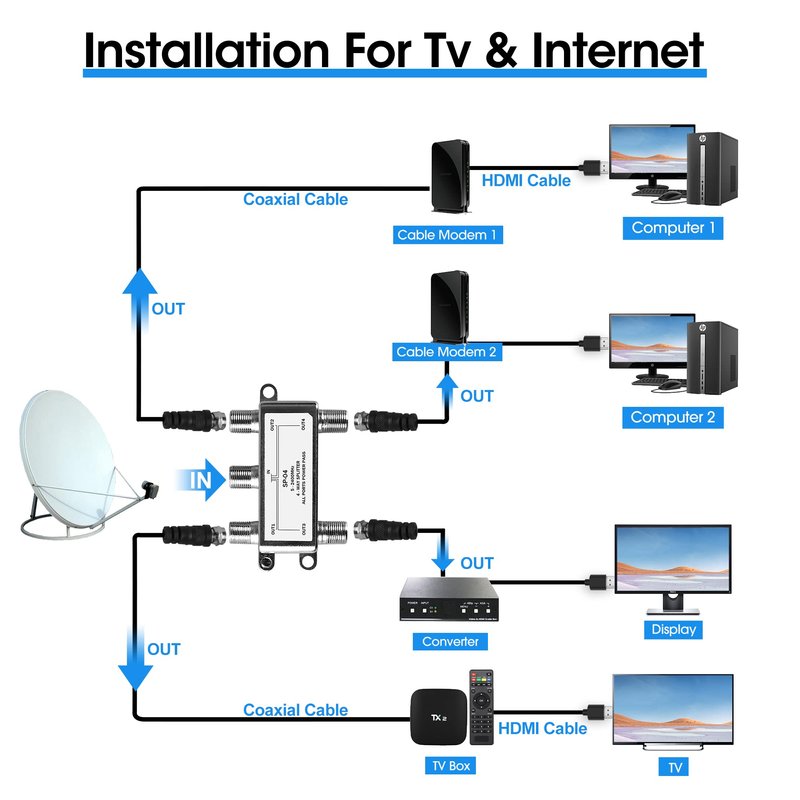- 4 WAY COAX CABLE SPLITTER: NEWCARE digital coaxial cable splitter can distribute one digital signal (Antenna, etc) to 4 devices (Cable Modem, Cable TV, etc). It is used for HD TV signals, satellite TV and high-speed Internet modems, as well as cable TV, amplified antennas, amplifiers, MoCA configurations and other coaxial equipment. Compatible with RG59 and RG6 coaxial cable.