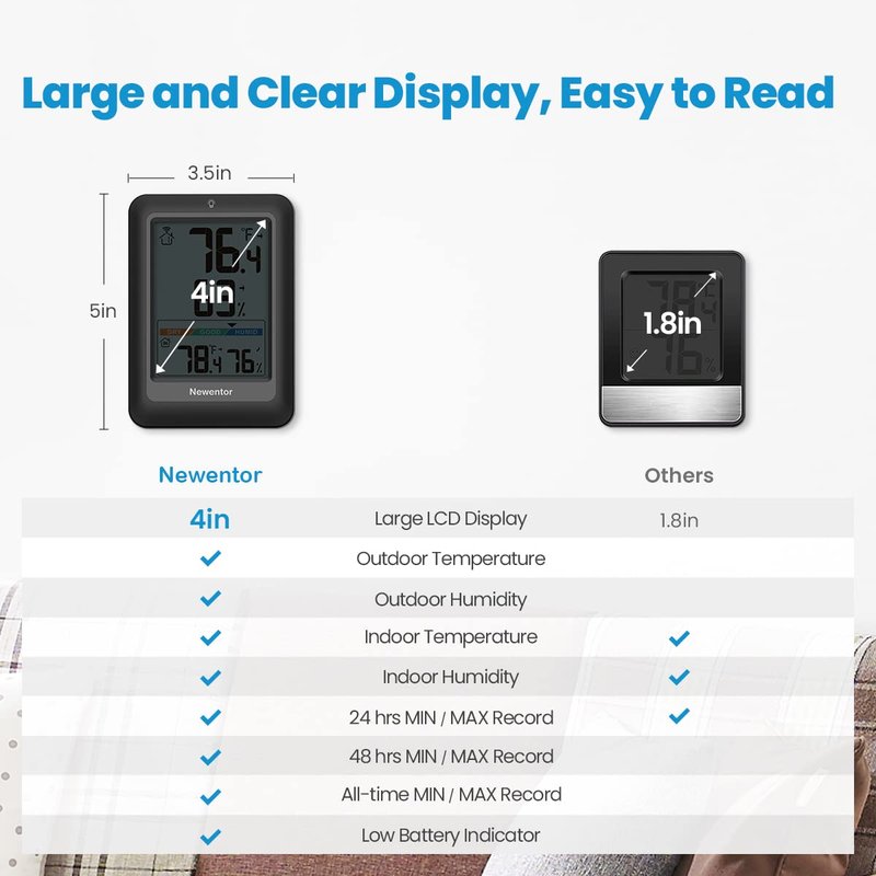 Newentor Indoor Outdoor Thermometer Wireless, Remote Temperature Monitor Hygrometer, Outside Inside Thermometers with Comfort Indicator, 4 Inch Screen Humidity Gauge, 328ft Range for Home Patio, Black