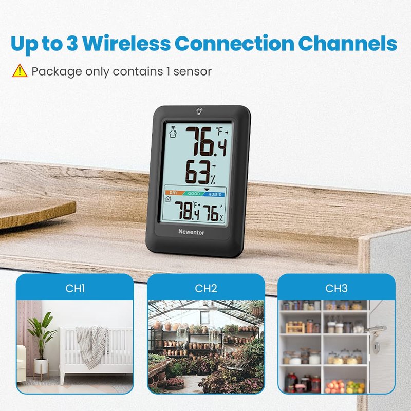 Newentor indoor outdoor thermometers has essential functions in daily life such as detection of indoor temperature & humidity, temperature & humidity of 3 channels, ice alert, comfort reminder, etc. High precision guarantees your life.